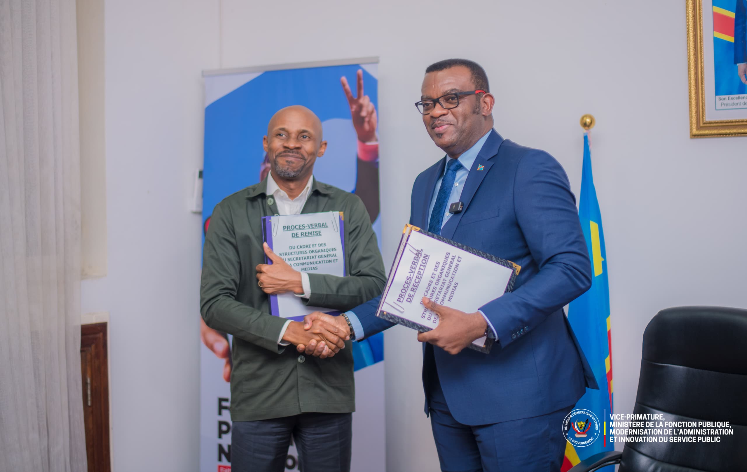 Dans le cadre de la réforme de l’administration publique voulue par le Président de la République, le Vice-Premier ministre en charge de la Fonction publique, Jean-Pierre LIHAU, a signé et remis, ce lundi 12 mai 2025, au ministre de la Communication et médias, Patrick Muyaya, le nouveau cadre et des structures organiques de l’administration de son ministère. Selon le Vice-Premier ministre Jean-Pierre LIHAU, le nouveau cadre et structures organiques sont un outil de gestion, de communication et d’évaluation qui définit explicitement les responsabilités des différents acteurs pour permettre au ministère de la Communication et médias de remplir pleinement son rôle dans l’organisation et la régulation du secteur des médias à travers les politiques gouvernementales adaptées.
